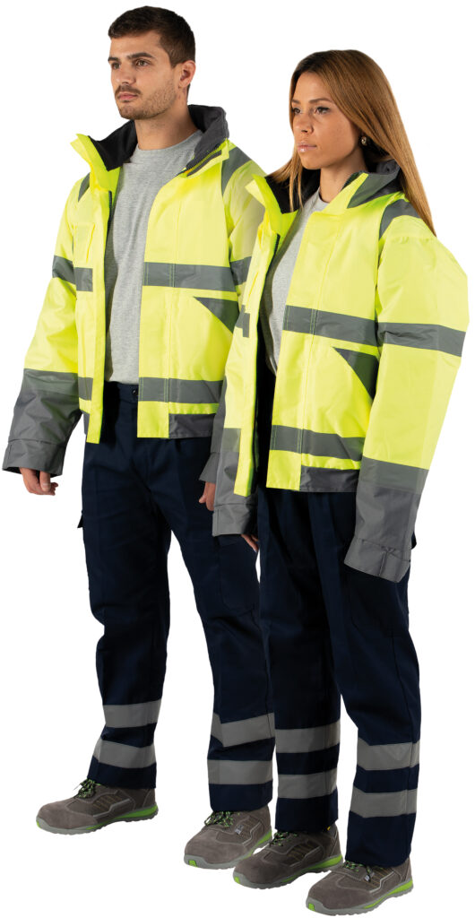 Ajuste de fecho e velcro na aba; Dois bolsos nas laterais com fecho; Elástico na cintura e nas mangas; forro polar; carapuço Certificado: EN ISO 20471, EN ISO 343:2003